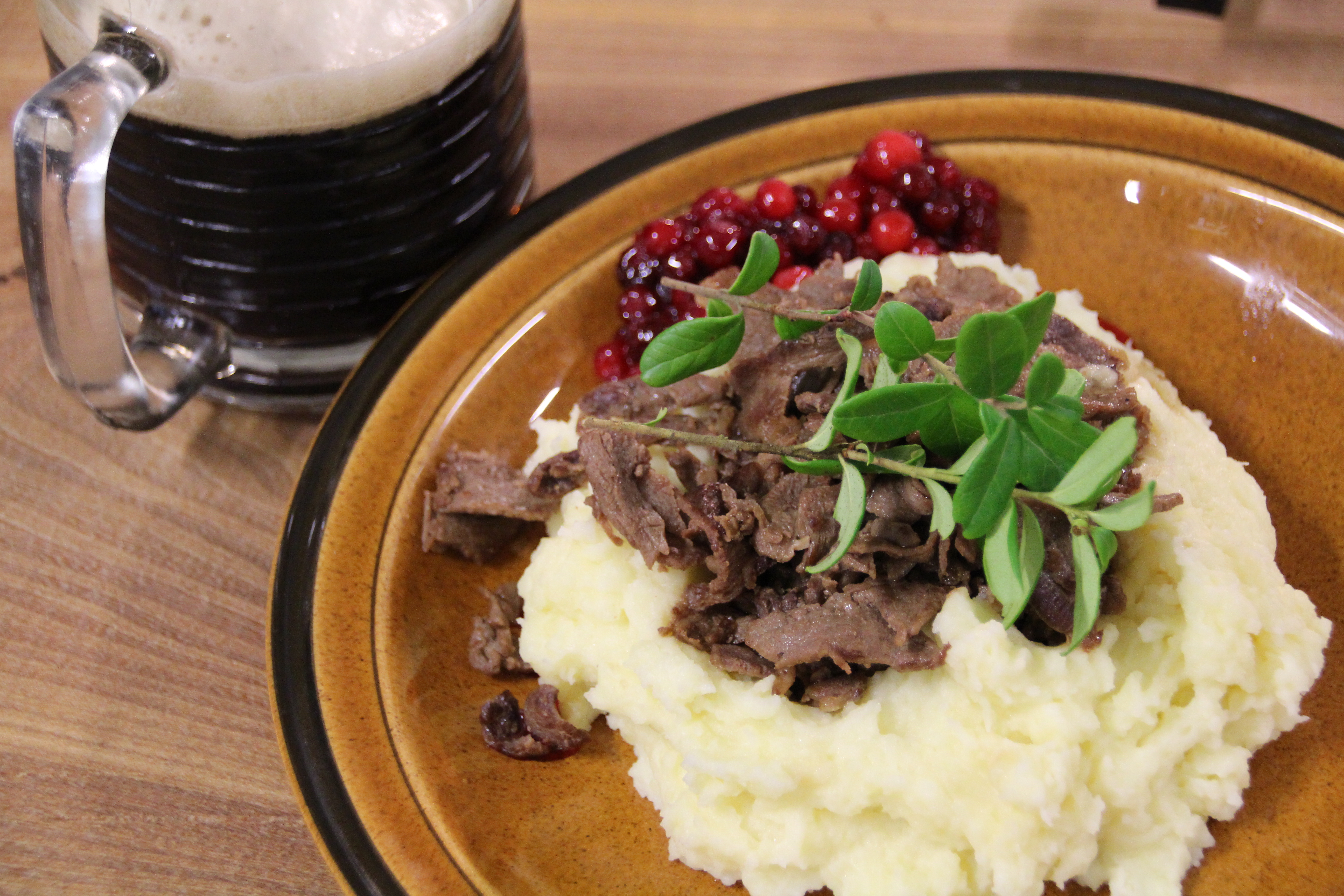 Kaupan pakasteesta pussillinen poron- tai riistakäristystä. Se kuumaan kasariin reilun voinokareen kanssa ja kun on hetken ”paistuneet” niin puoli pulloa tummaa luomu lageria sekaan. Toisen puolikkaan voi nautiskella kokatessa tai vasta ruuan kanssa. Anna hautua 20 min välillä hämmennellen. Maista lopuksi, että suolaa on sopivasti.