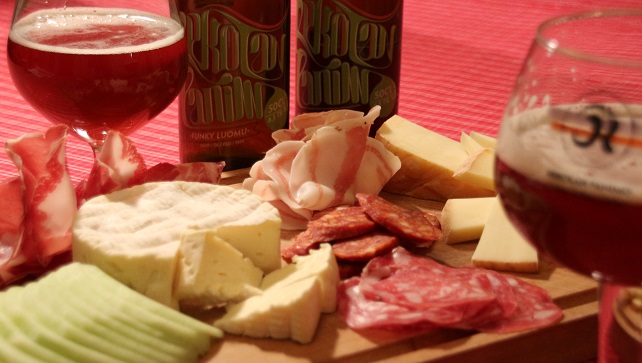 Chorizoa, panchettaa, salamia, juustoja ja Funky Luomu -olutta.