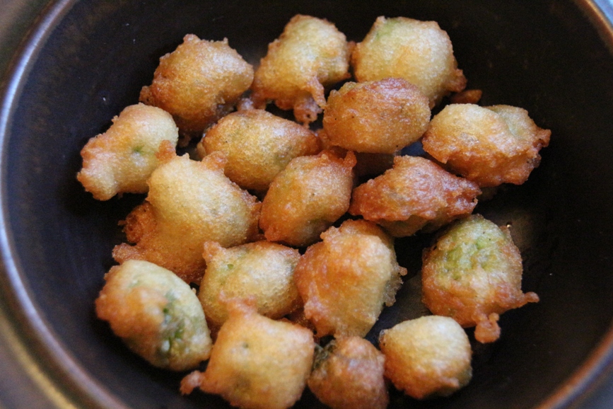 Fritatut humalat olivat maukkaita, pikantilla kirpakkuudella ryyditettynä. Varsin hyviä ja beer&food -aiheeseen osuvia naposteltavia. Ruokajuomana toimii hyvin Metsänhenki, Funky Luomu ja Amerikan Serkku.