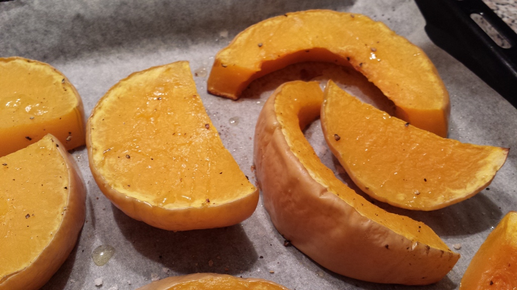 Myskikurpitsa halkaistaan, pehmyt siemenosa poistetaan ja kurpista lohkotaan. Lohkot leivinpaperin päälle uunipellille, päälle oliiviöljyä, rouhittua mustapippuria ja suolaa. Kurpitsat paahdetaan pehmeiksi 200 asteisessa uunissa noin puoli tuntia, minkä jälkeen kurpitsanlohkoista poistetaan kuori.